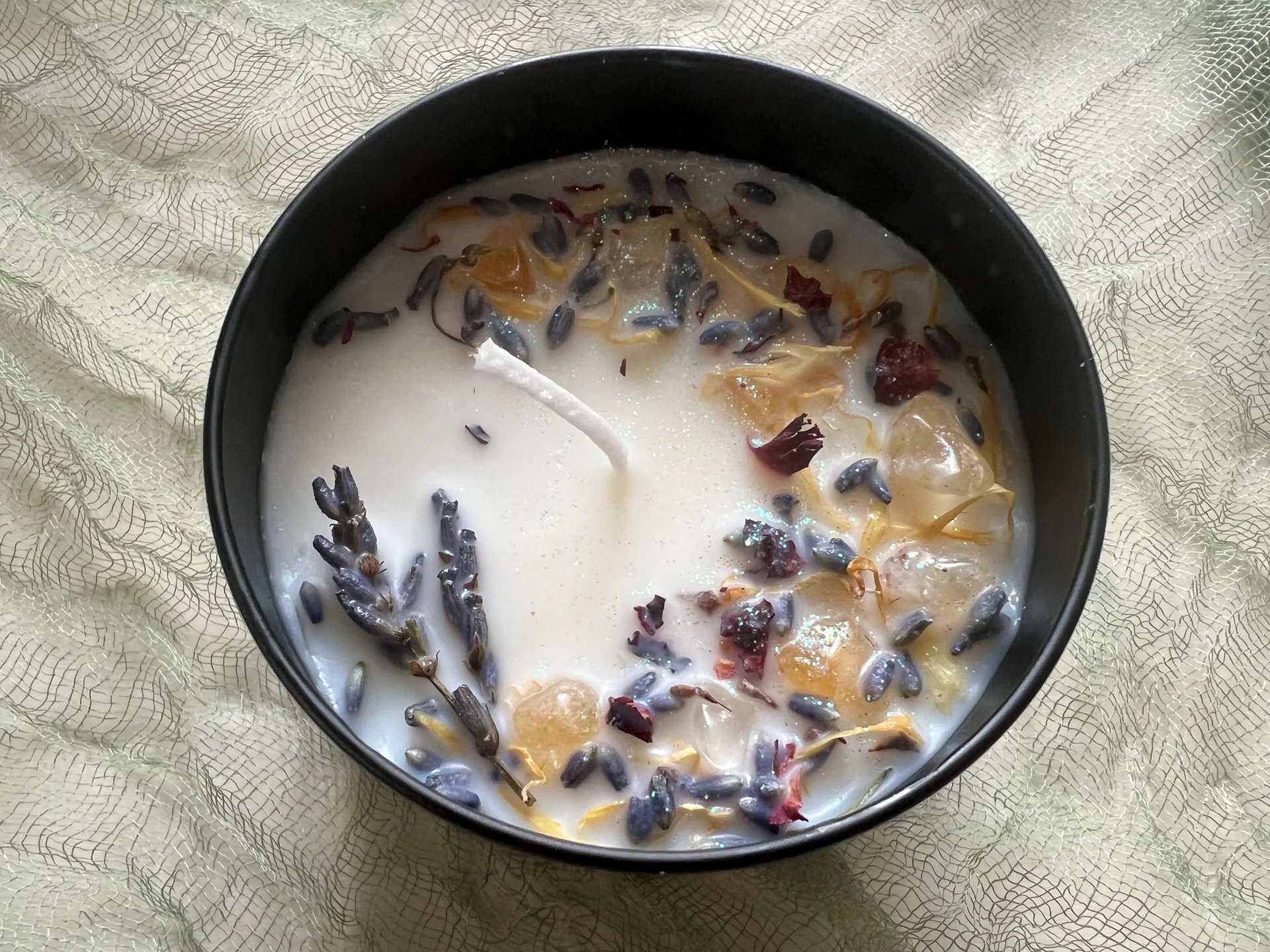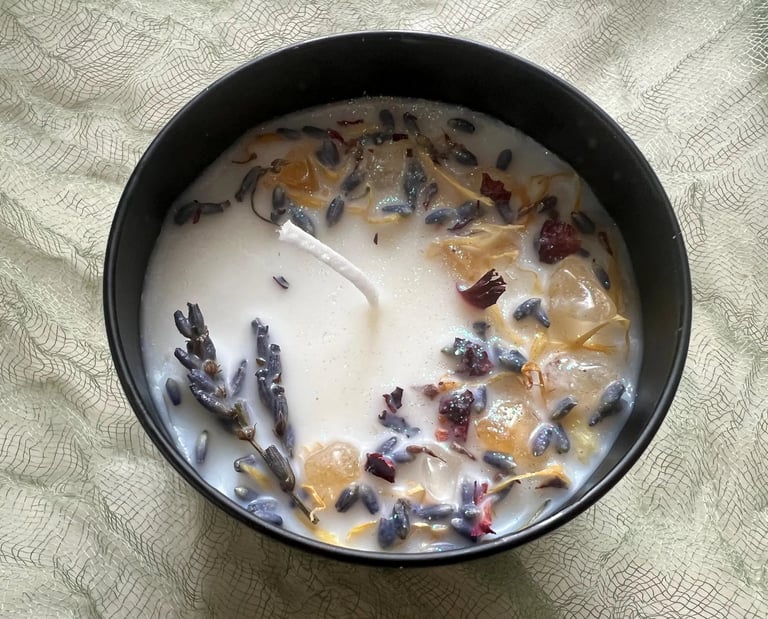 Meditation Candles topped with dried herbs and crystals to aid with magical workings.