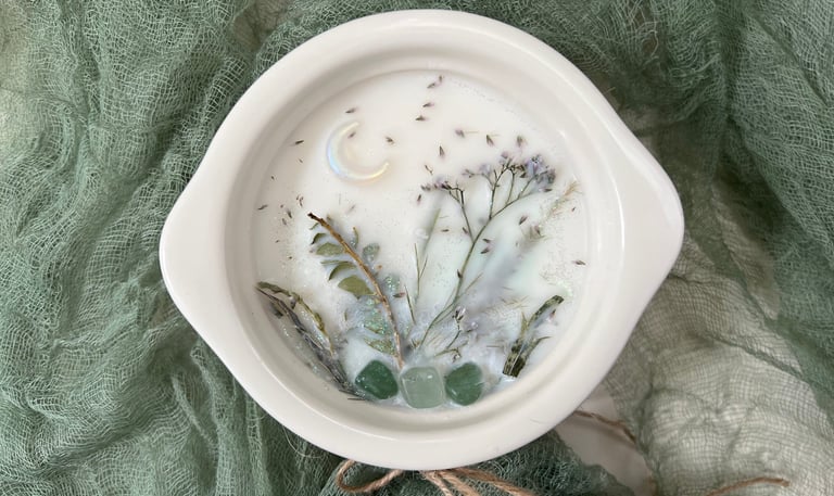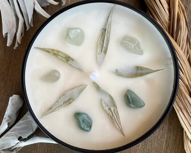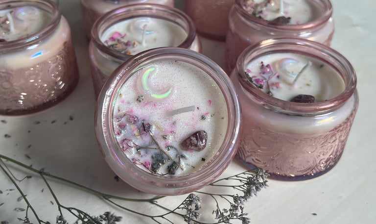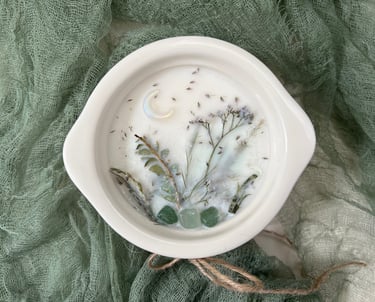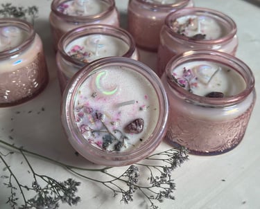 This series of moonlight garden candles was created to honor the full moons of the year and aid with magical workings & meditations. Each candle has an opalescent glass moon, dried botanicals & Crystals. They are soy wax based with a cotton wick. They are scented with natural fragrance oil or essential oils.