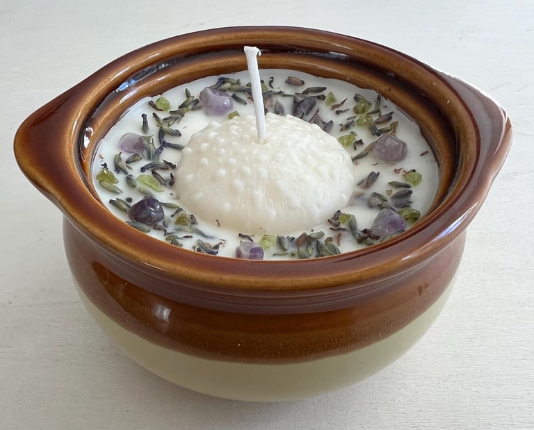 Shown here: 8 oz soy based cotton wick candle in vintage brown ceramic cauldron. Topped with amethyst, peridot, & dried lavender. Scented with our lavender dreams custom essential oil blend.